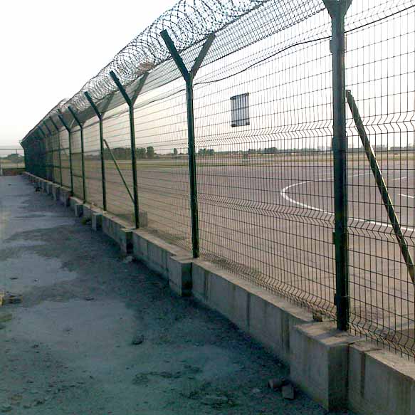 機(jī)場圍網(wǎng) 機(jī)場圍界 機(jī)場護(hù)欄網(wǎng)又叫鋼筋網(wǎng)圍界,主要用V型支架立拄,加強(qiáng)型焊接片網(wǎng),安全防盜連接件和熱鍍鋅刀片刺籠組成強(qiáng)度和安全