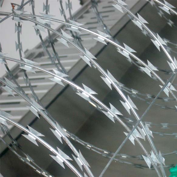 鍍、熱鍍。 編織特點: 擰編而成;牢固、美觀; 產(chǎn)品特點:監(jiān)獄防護網(wǎng)具有防腐、防老化、抗曬、耐候等特點。螺旋型交叉刀片刺網(wǎng)是在