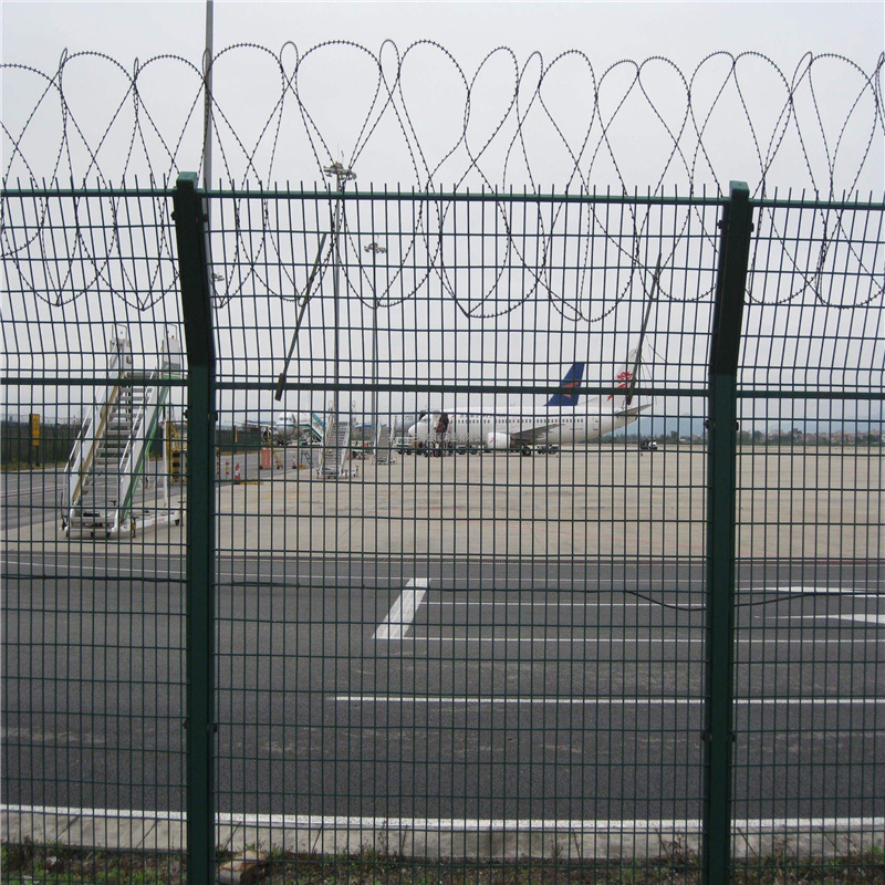 機(jī)場圍界隔離柵又稱作機(jī)場隔離柵“Y型安全防御護(hù)網(wǎng)”,是由V型支架立柱,加強(qiáng)型焊接片網(wǎng),安全防盜連接件和熱鍍鋅刀片刺網(wǎng)組成強(qiáng)度